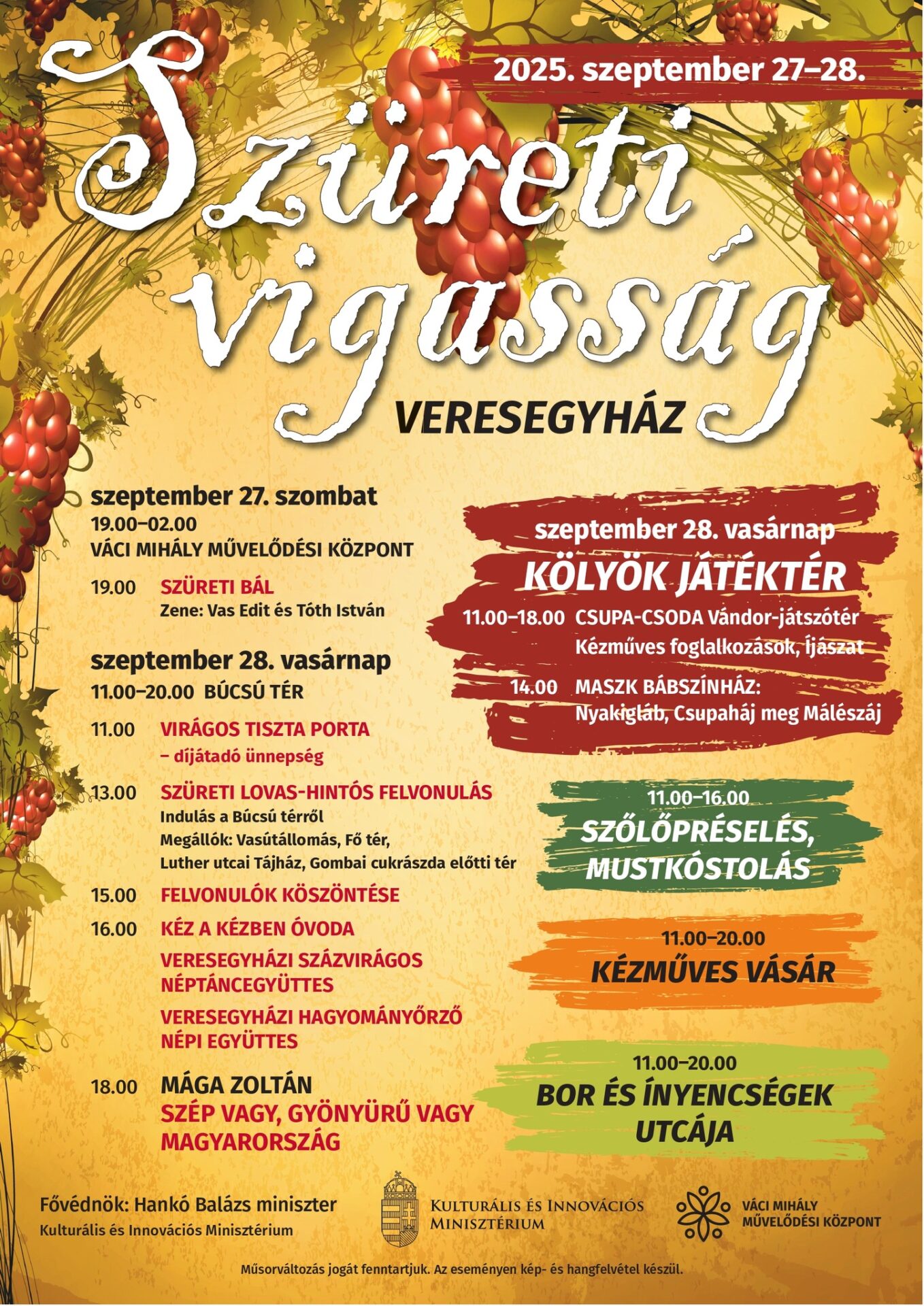 A vigasságot megelőző napon, szeptember 27-én, szombaton Szüreti Bál lesz a Váci Mihály Művelődési Központban este 7 órától egészen hajnali 2 óráig, Vas Edi és Tóth István zenéjével.
