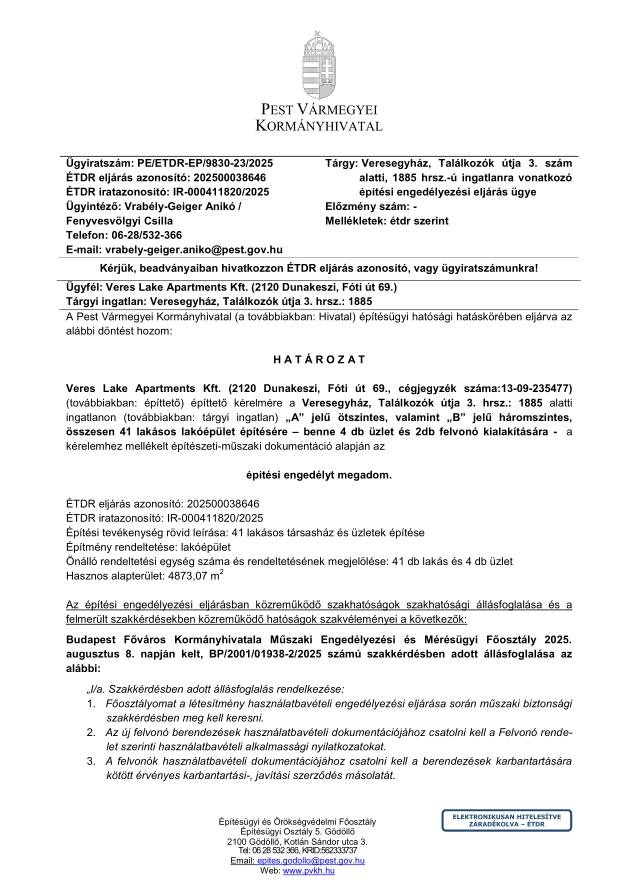 A Pest Vármegyei Kormányhivatal építési engedélyezési eljárásának határozata, amelyet a Veres Lake Apartments Kft. számára állítottak ki, megerősíti a projekt megvalósulását.